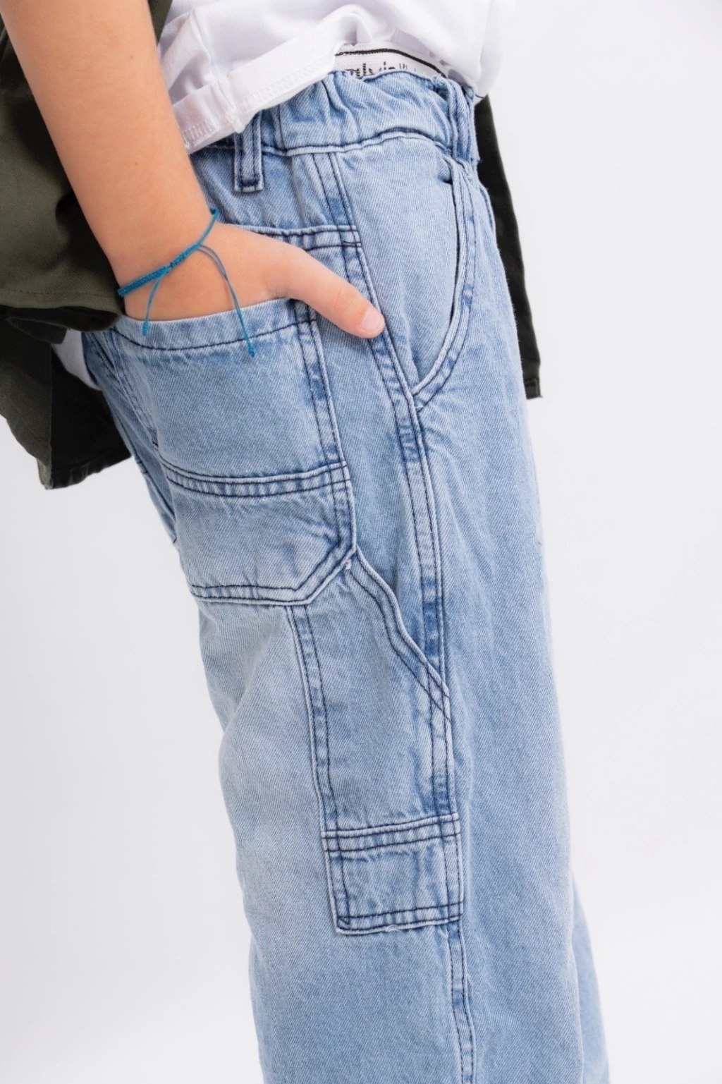 Jean celeste nevado con bigotes. Tela rigida. Corte baggi con bolsillo carpintero.