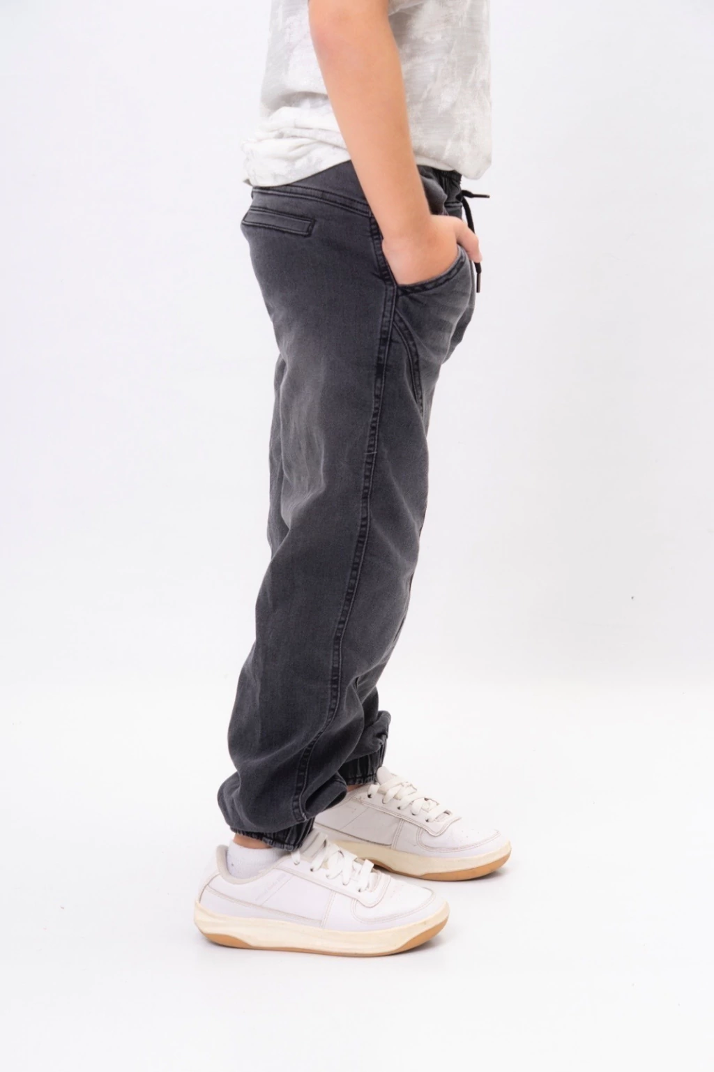 Jogger de jean elastizado. Con recortes. Lavado desgastado. Corte baggi ancho.